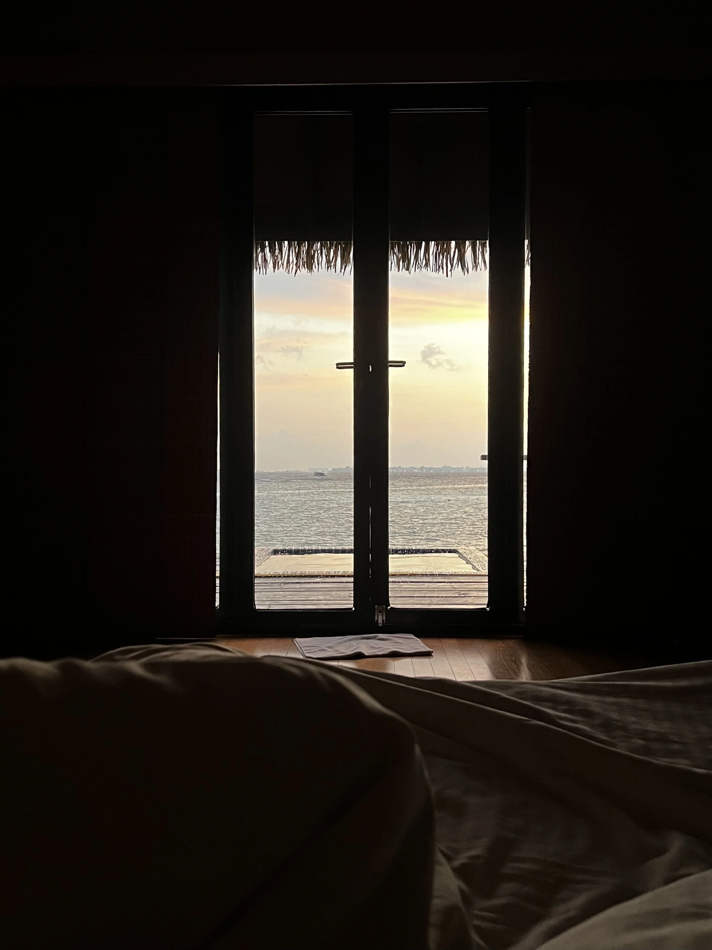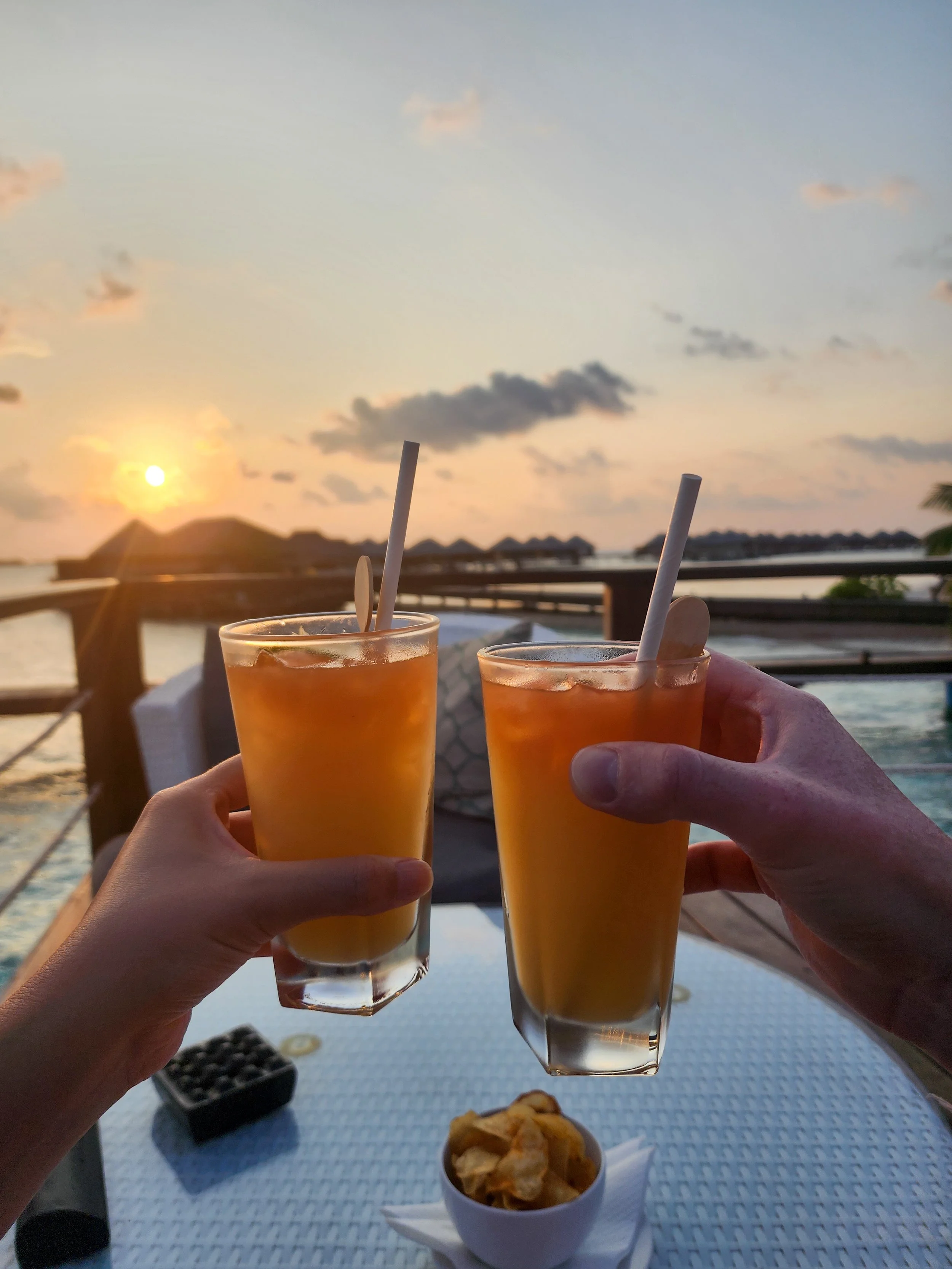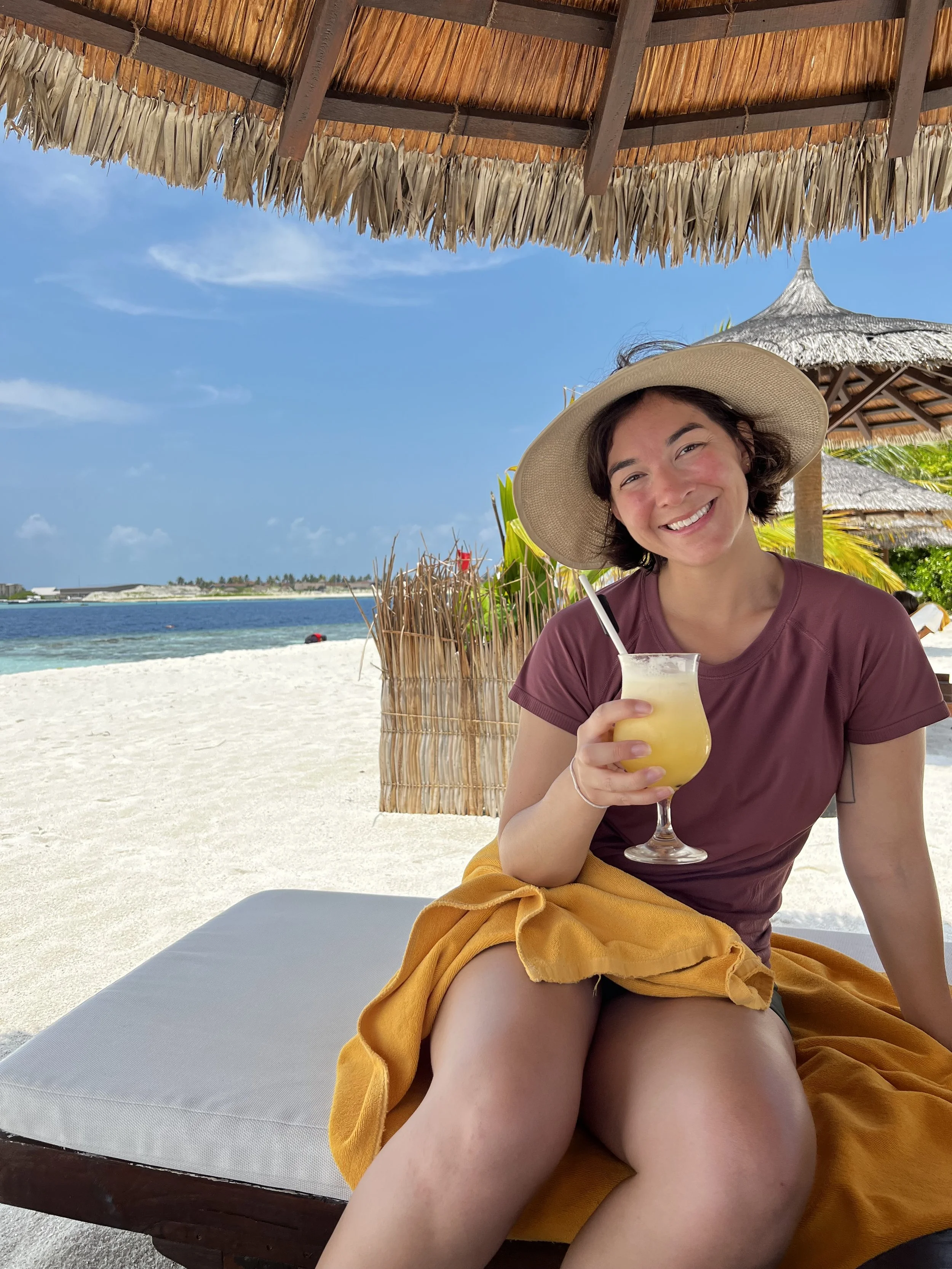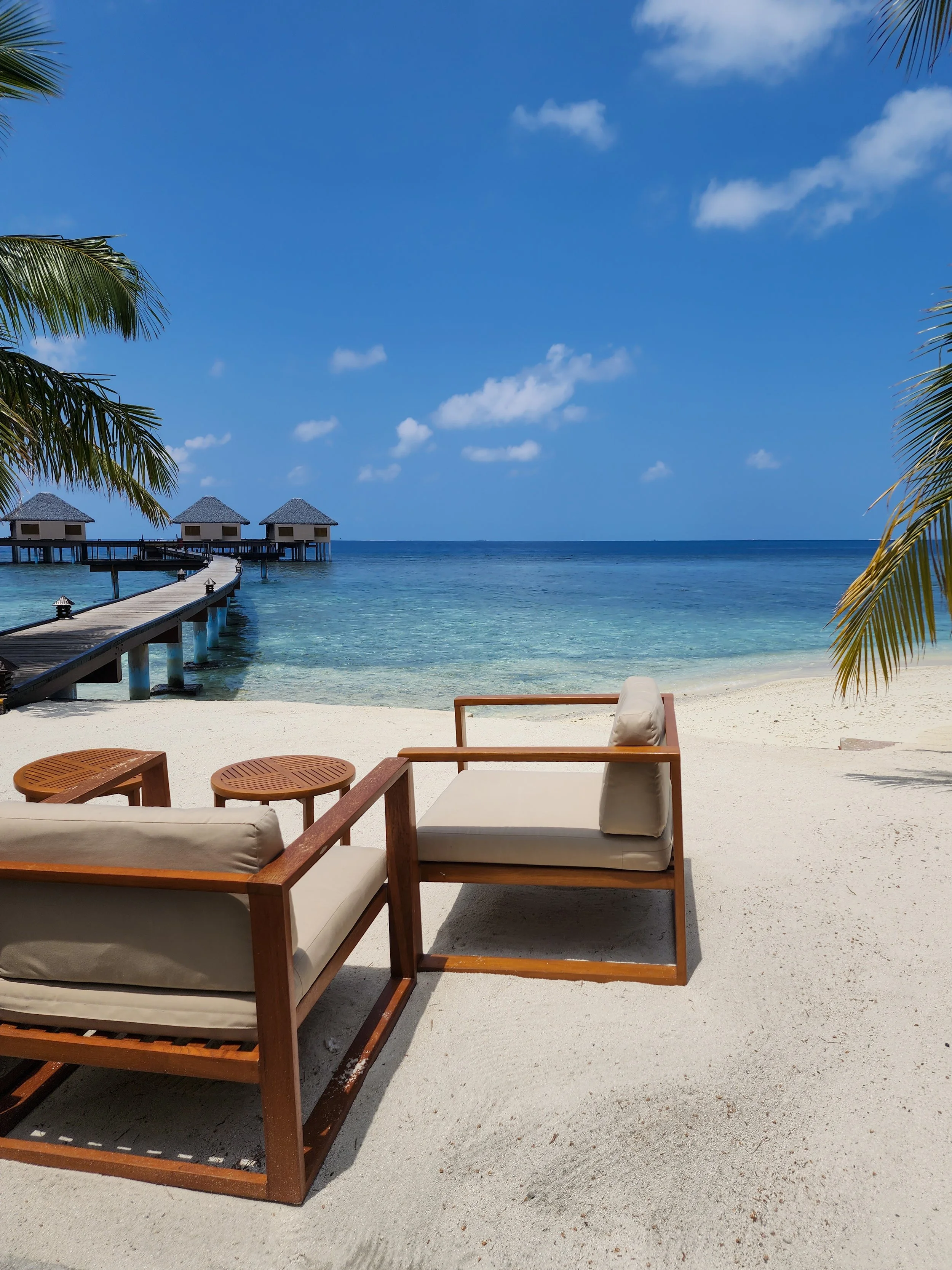 We set out early from our overnight hotel in Male to get to the water taxi. It absolutely started with White Lotus vibes again, so when we pulled up and they put a cute banana leaf necklace on us and then were handed the most delicious, iced tea/passion fruit/mango juice drink when we got to the check in location it all seemed on par. We were introduced to our ‘butler’ (lololol) who then gave us a tour and walked us to our room!! And, by room I mean, overwater bungalow! Going through the wood fence, there was a huge deck, with steps down to the ocean and a plunge pool facing the sunrise. We faced part of the island, the white beaches and teal water with a cute swing, perfect for Instagram. Turning around we walked into our room, that had an entire glass wall with a king bed and a few couches and lounge chairs. There were full closets on both sides of the room along with desks and a (very) fancy Bluetooth speaker for us. But, the best part, was the bathroom! Not only was it styled perfectly, sleek and sophisticated. When you looked down though there was a glass portion of the floor, where you could see the fish swimming around below. Unbelievable! Our butler told us not to stand on it because it might break (!!), we both believed him and said ‘okokokok’ and then he bust our laughing. I guess it was a joke! Ha!