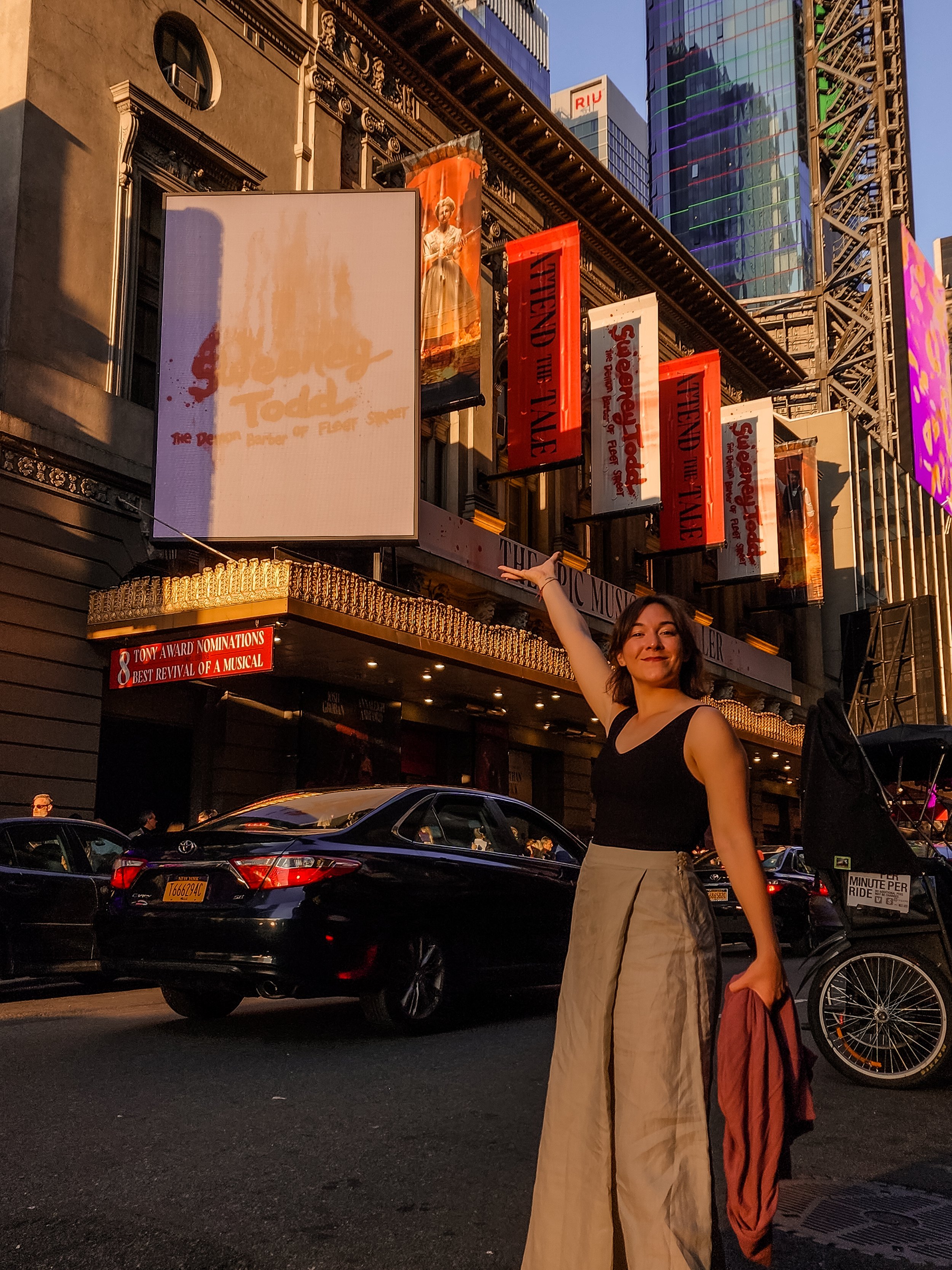 Anywho, so the train then sent us in a deep spiral of not enough time for the next few things we needed to do. We got to the apartment, we got dressed and ready for our first Broadway show ever in about 15 minutes before sprinting to dinner. We shoveled food in our bodies and then speed walked over to our show. The line was already down an entire city block (which is like 4 normal city block lengths). But I HAD to get my preshow picture! But, by the time we then got in line it was MUCH further. The person tending to the line ensured we’d all get in and would see the performance. So we twiddled our thumbs and made projections on how incredible the show would be while we waited to enter. The good thing about a long line is by the time you get to your seats, there is hardly no down time before the show starts!